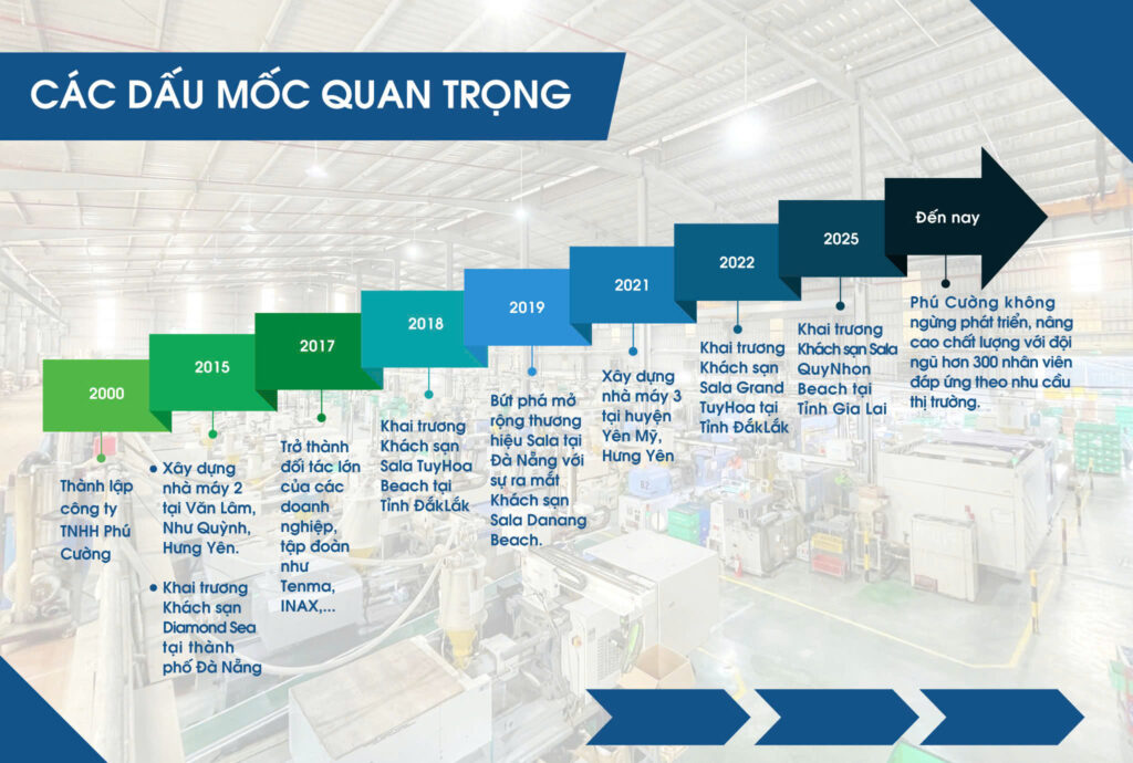 Công ty TNHH Phú Cường được thành lập năm 2000, chuyên sản xuất các sản phẩm nhựa như phụ tùng xe máy, linh kiện điện tử, thiết bị vệ sinh,… Trải qua hơn 20 năm phát triển, công ty đã khẳng định vị thế của mình trên thị trường với đội ngũ nhân viên giàu kinh nghiệm, hệ thống máy móc hiện đại và quy trình kiểm soát chất lượng nghiêm ngặt.